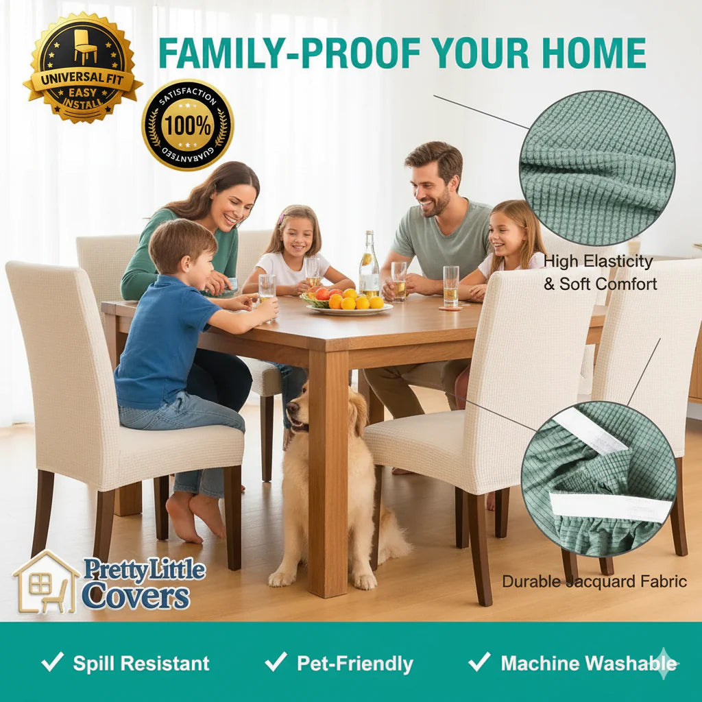 Uses a stretch-fit jacquard fabric with a waterproof inner layer that blocks spills instantly. Det sträcker sig, fäster och förvandlar dina stolar på några sekunder — inga verktyg, ingen stress, inga stora utgifter.